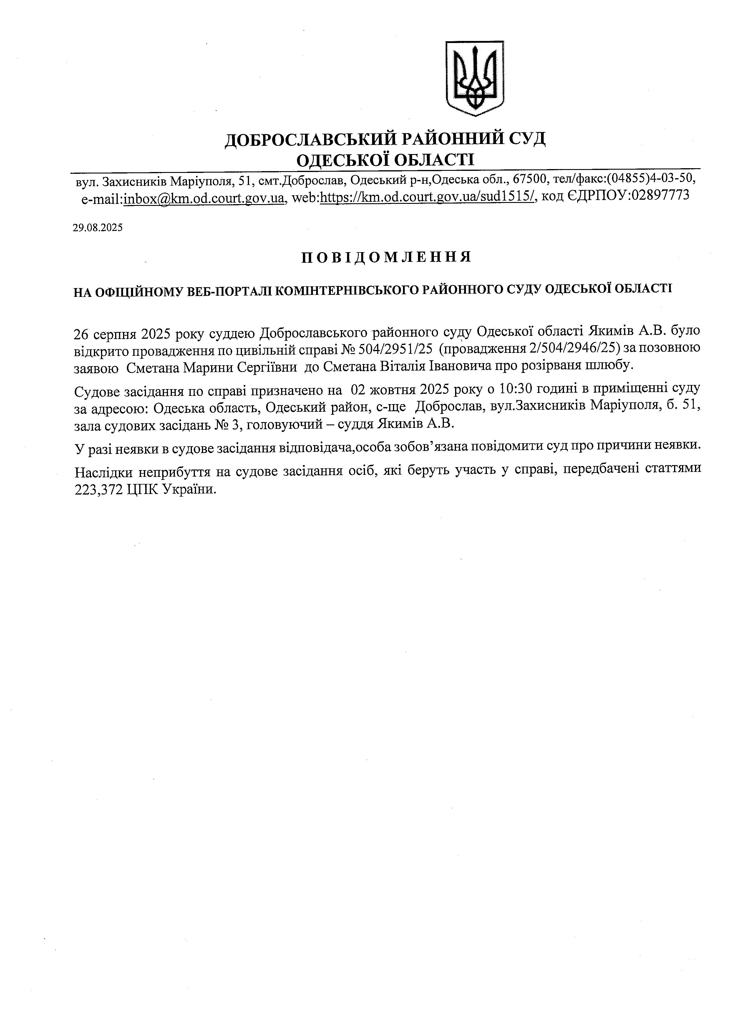 Повідомлення по справі №504/2951/25 стосовно Сметана Віталія Івановича