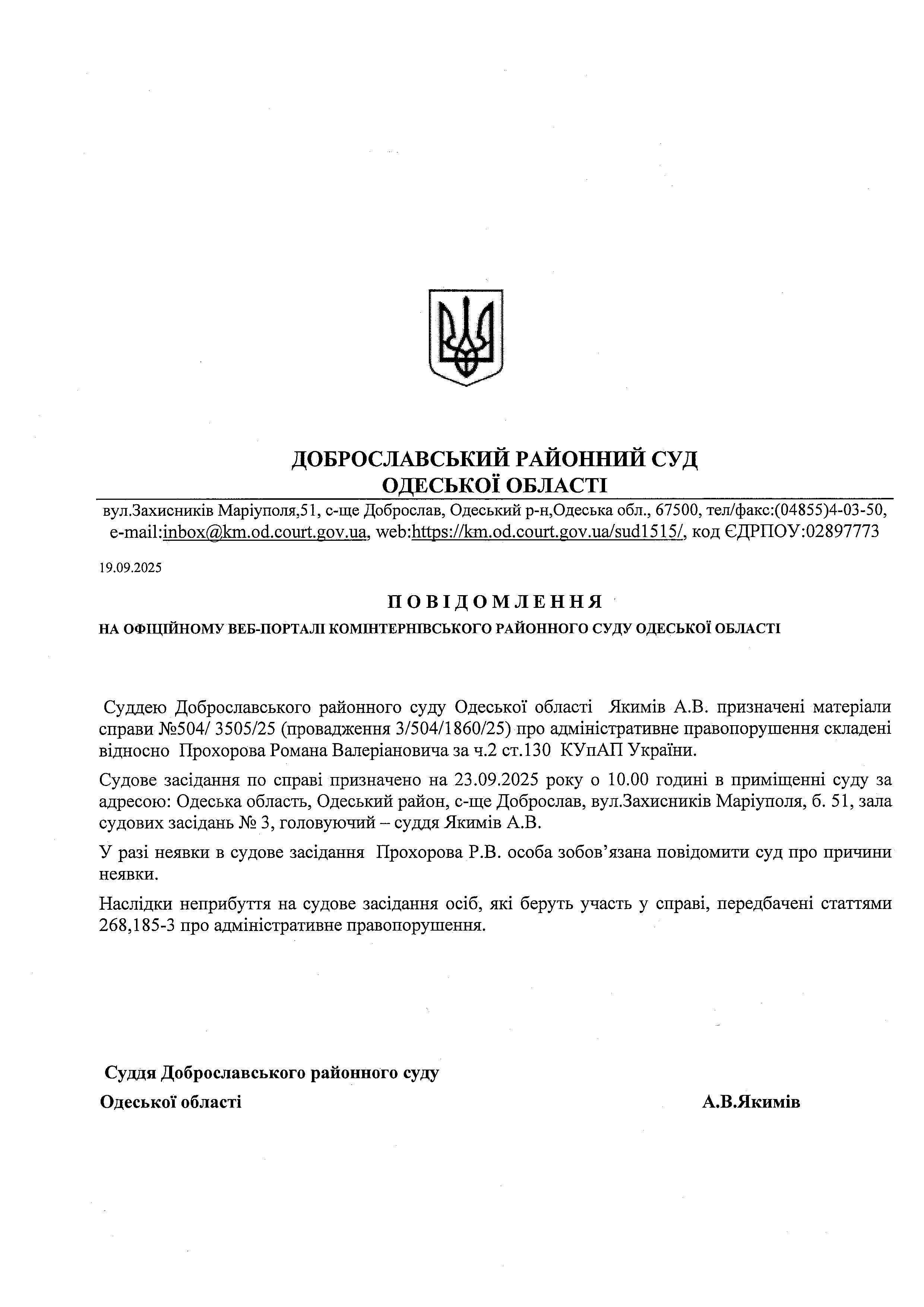 Повідомлення по справі №504/3505/25 стосовно Прохорова Романа Валеріановича