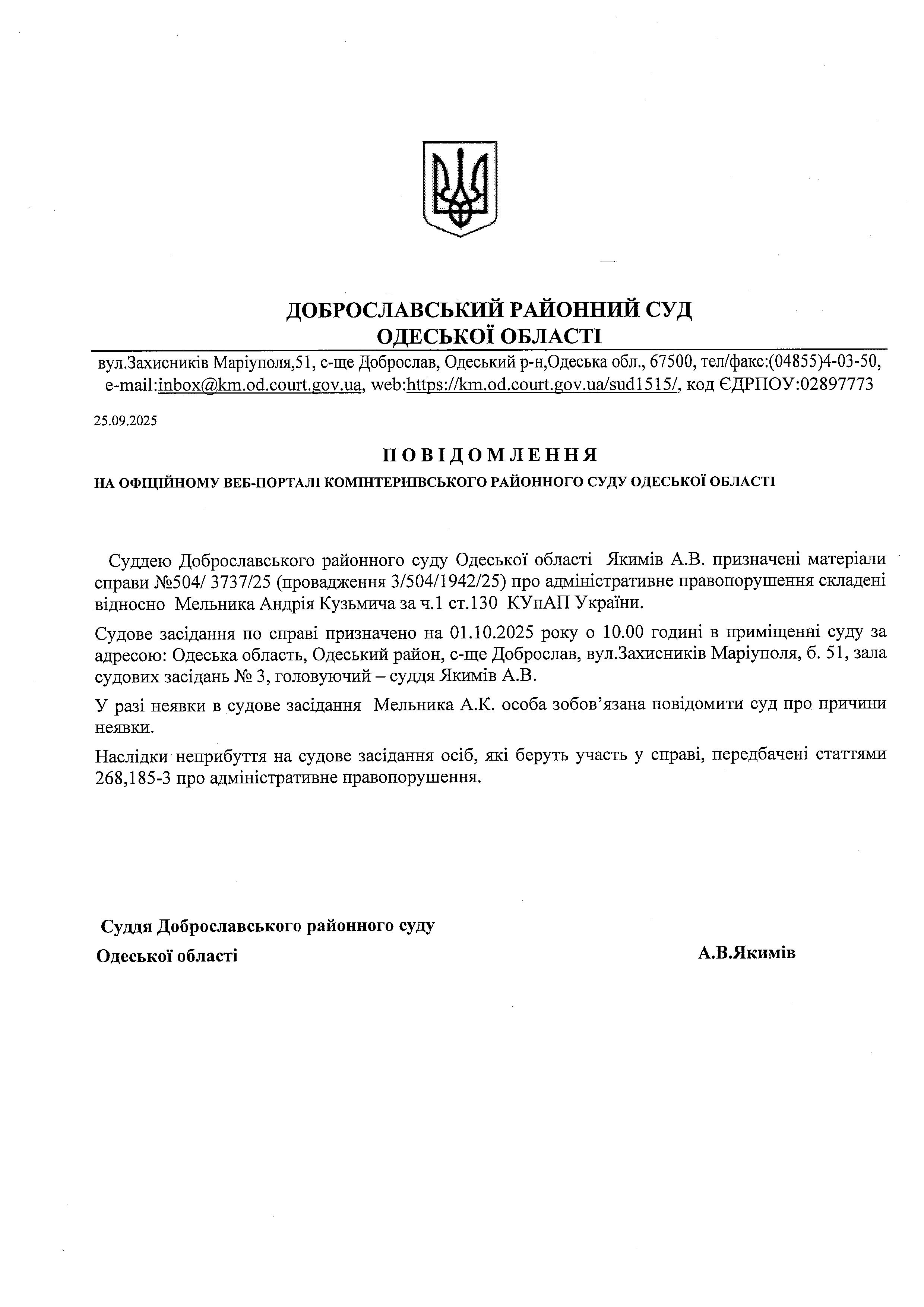 Повідомлення по справі №504/3737/25 стосовно Мельника Андрія Кузьмича