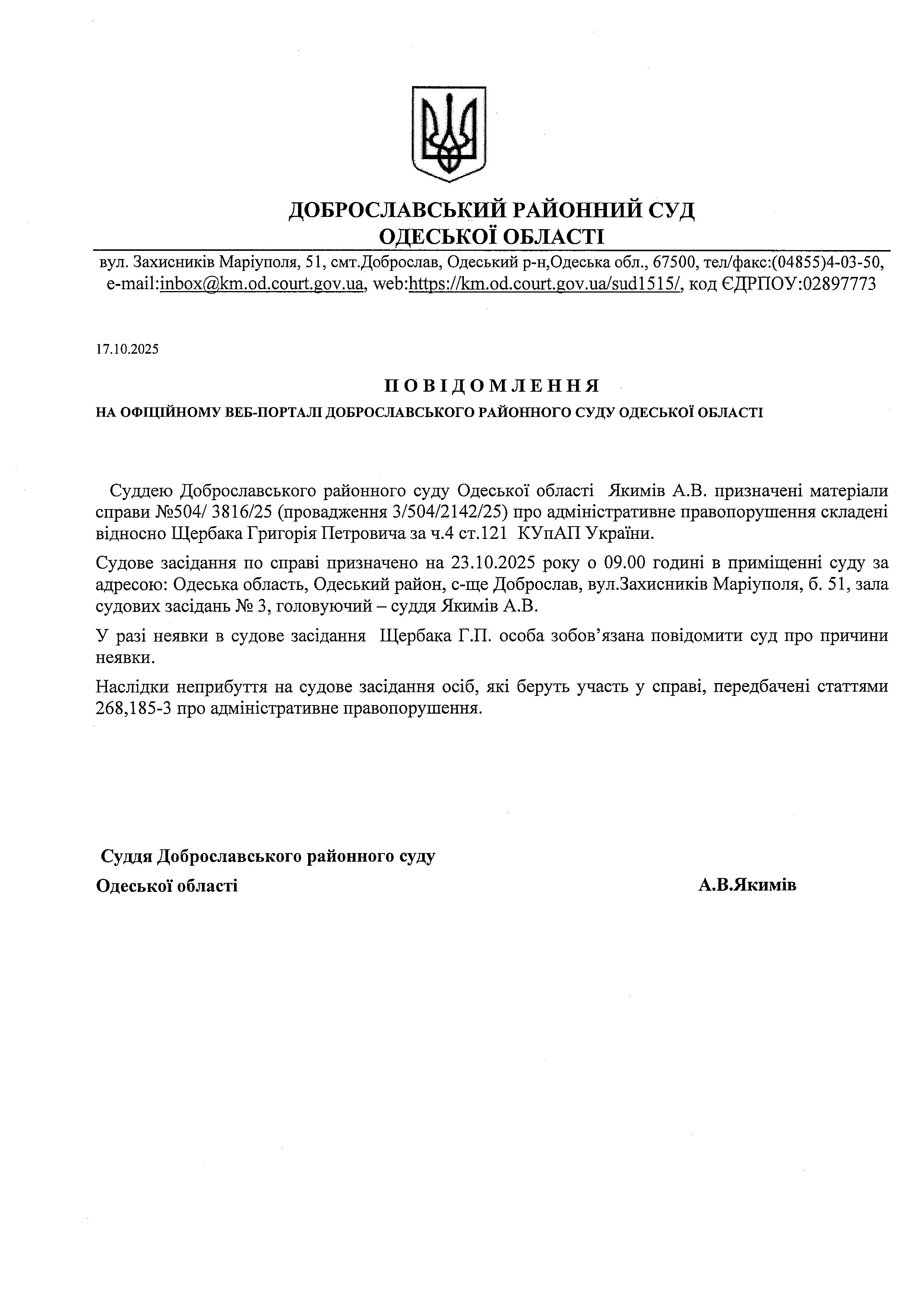 Повідомлення по справі №504/3816/25 стосовно Щербака Григорія Петровича