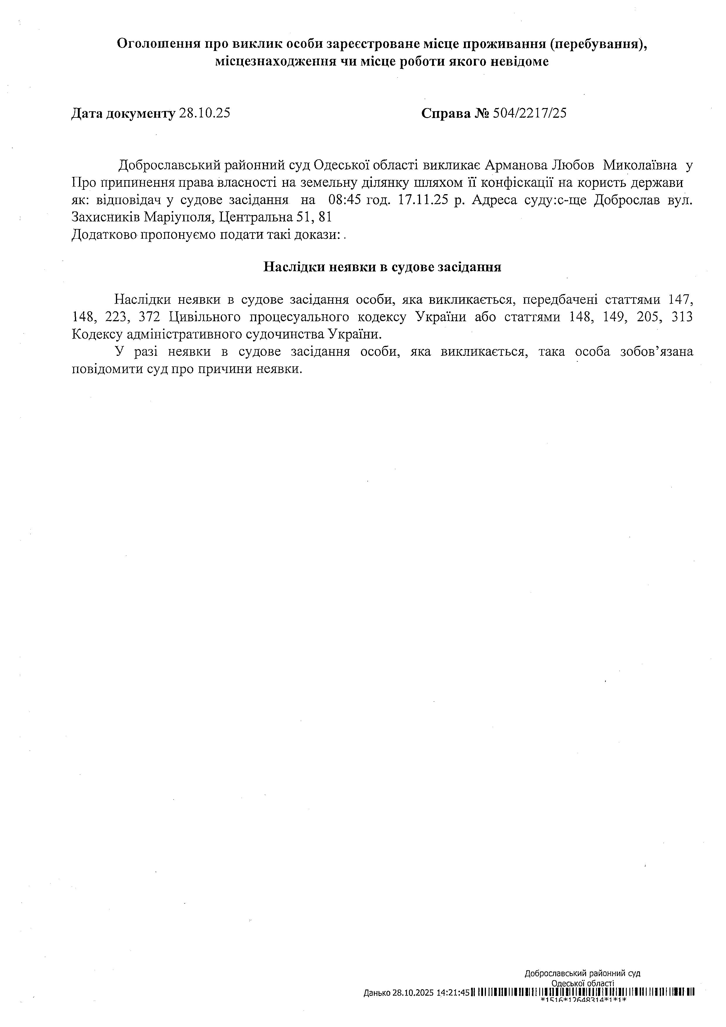 Повідомлення по справі №504/2217/25 стосовно Арманової Любові Миколаївни