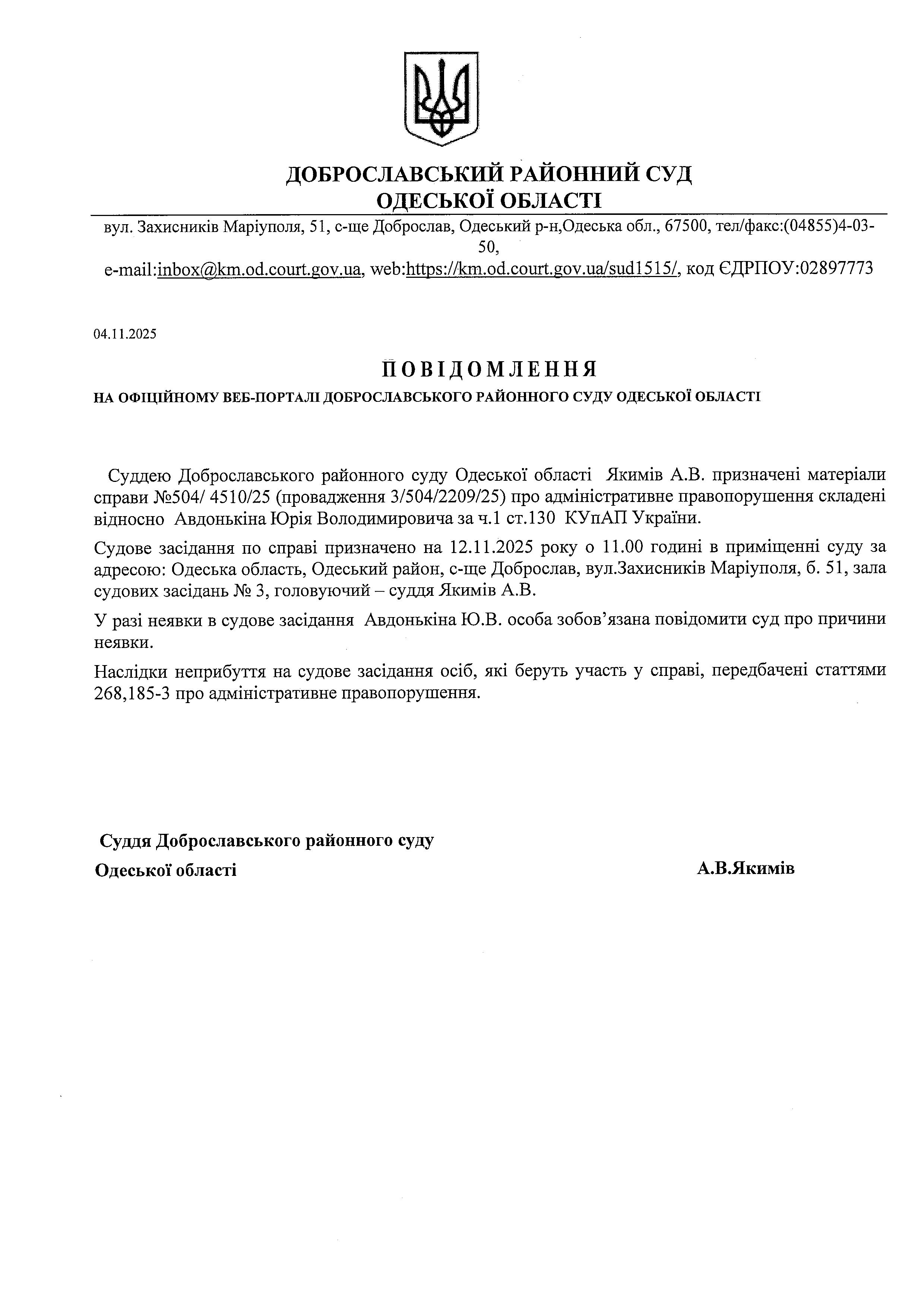 Повідомлення по справі №504/4510/25 стосовно Авдонькіна Юрія Володимировича