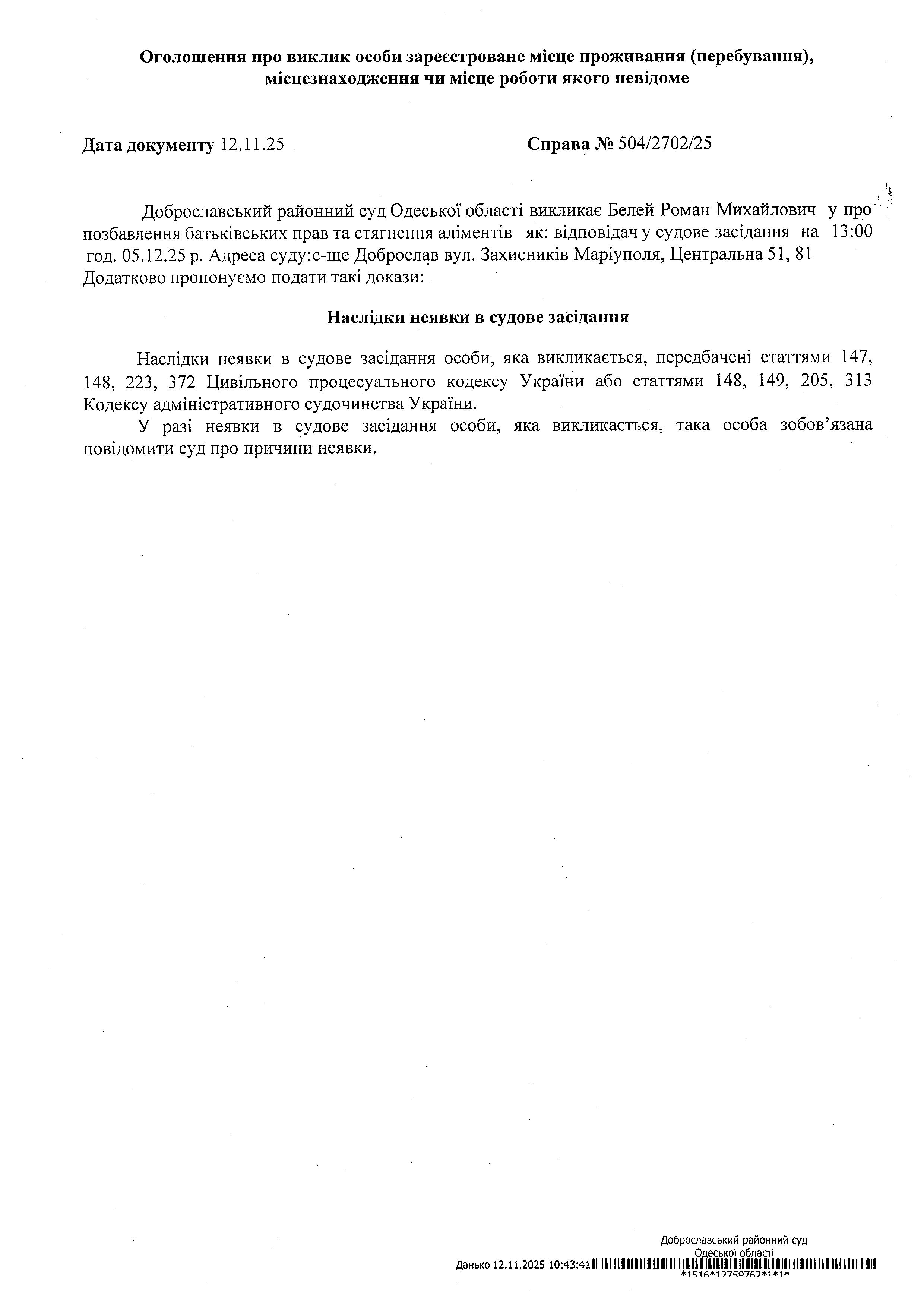 Повідомлення по справі №504/2702/25 стосовно Белей Романа Михайловича