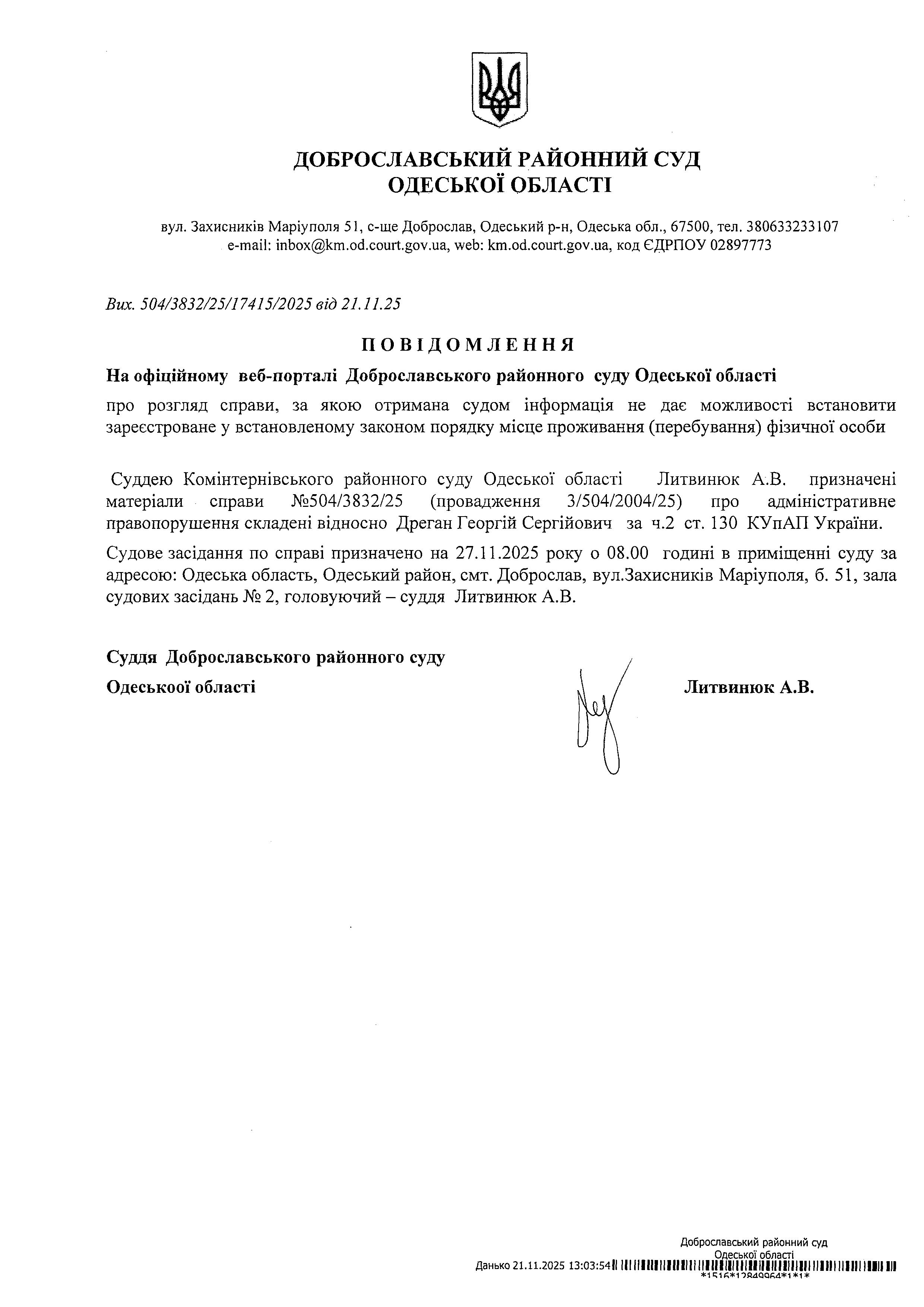 Повідомлення по справі №504/3832/25 стосовно Дрегана Георгія Сергійовича