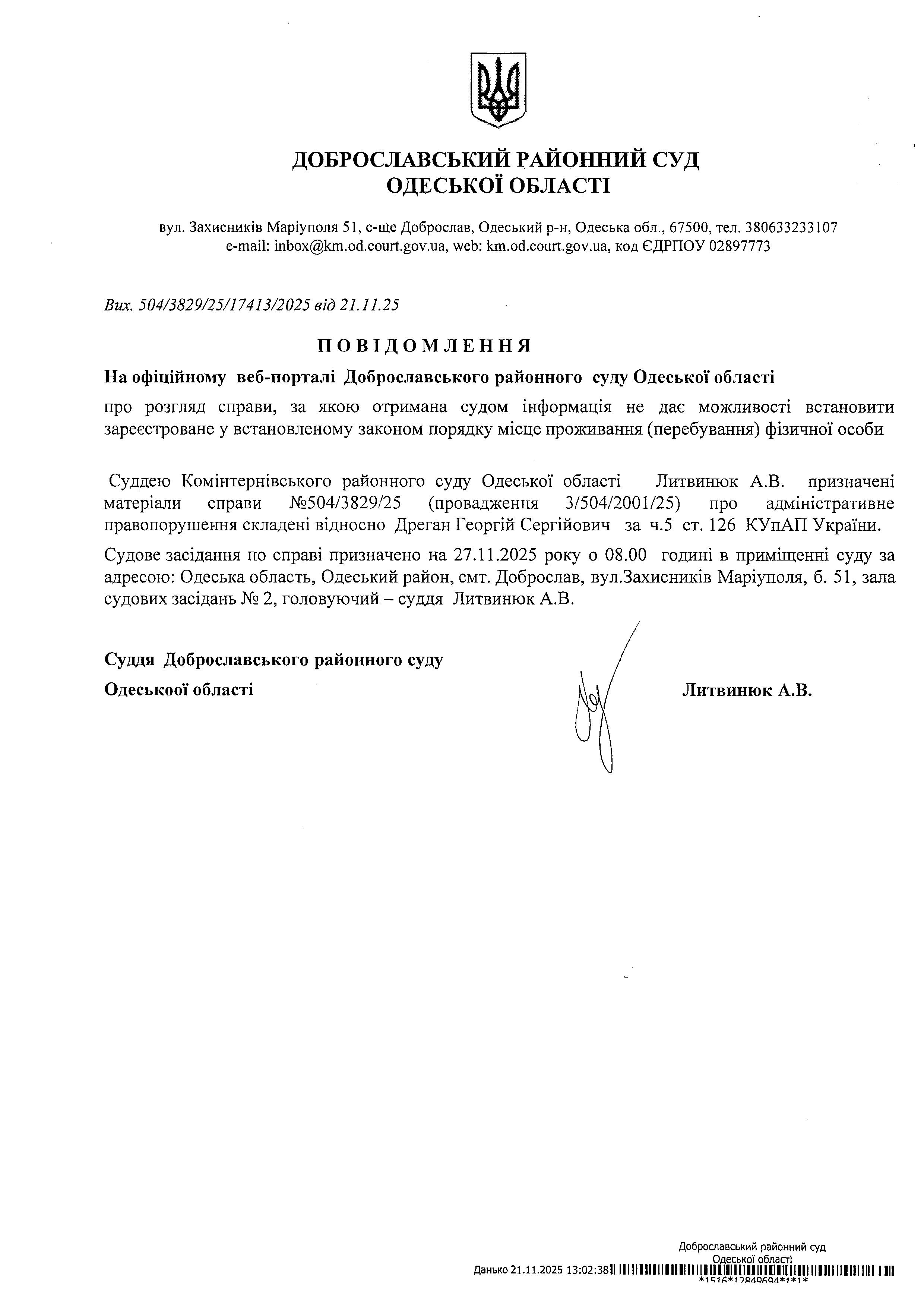 Повідомлення по справі №504/3829/25 стосовно Дрегана Георгія Сергійовича