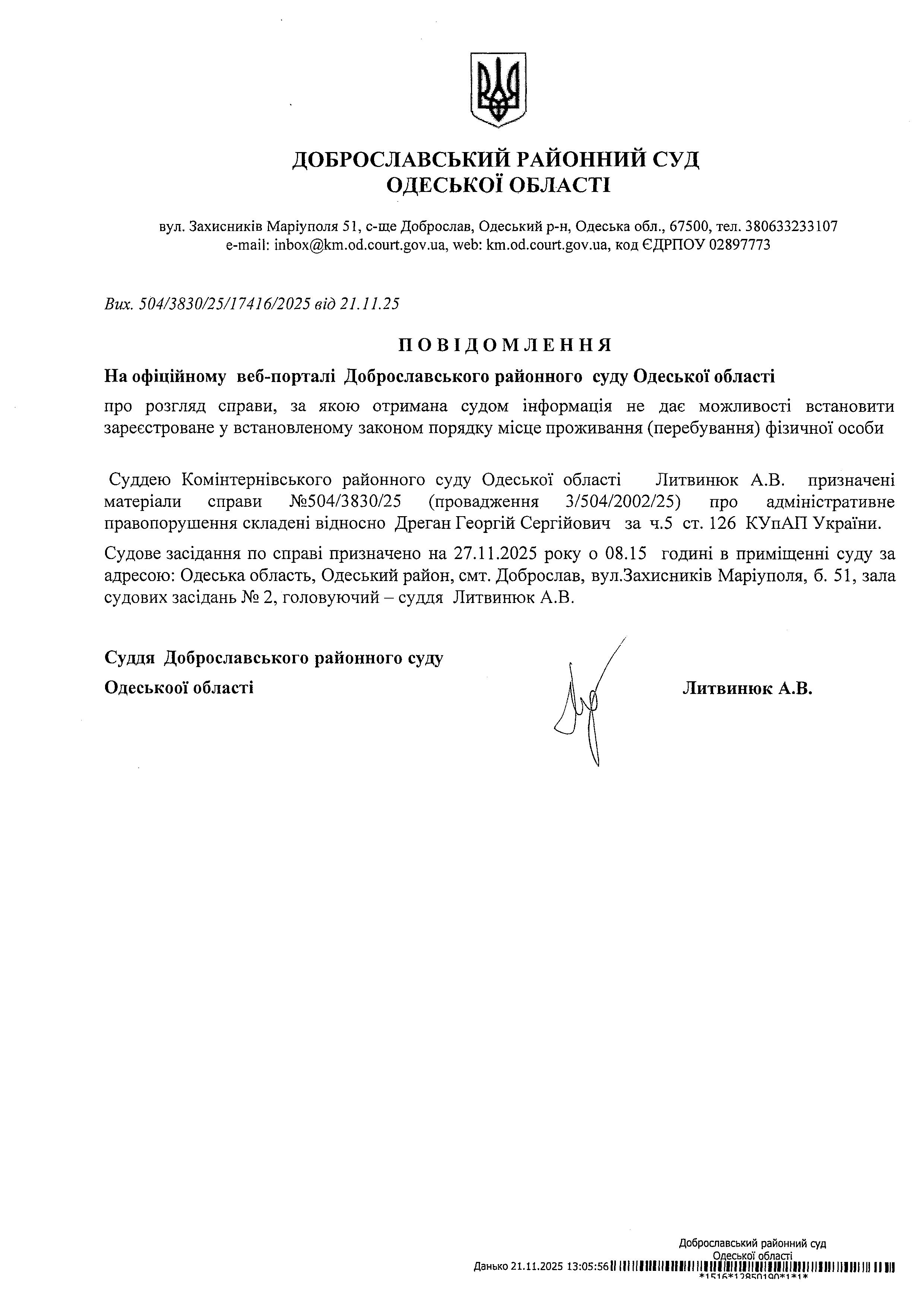 Повідомлення по справі №504/3830/25 стосовно Дрегана Георгія Сергійовича