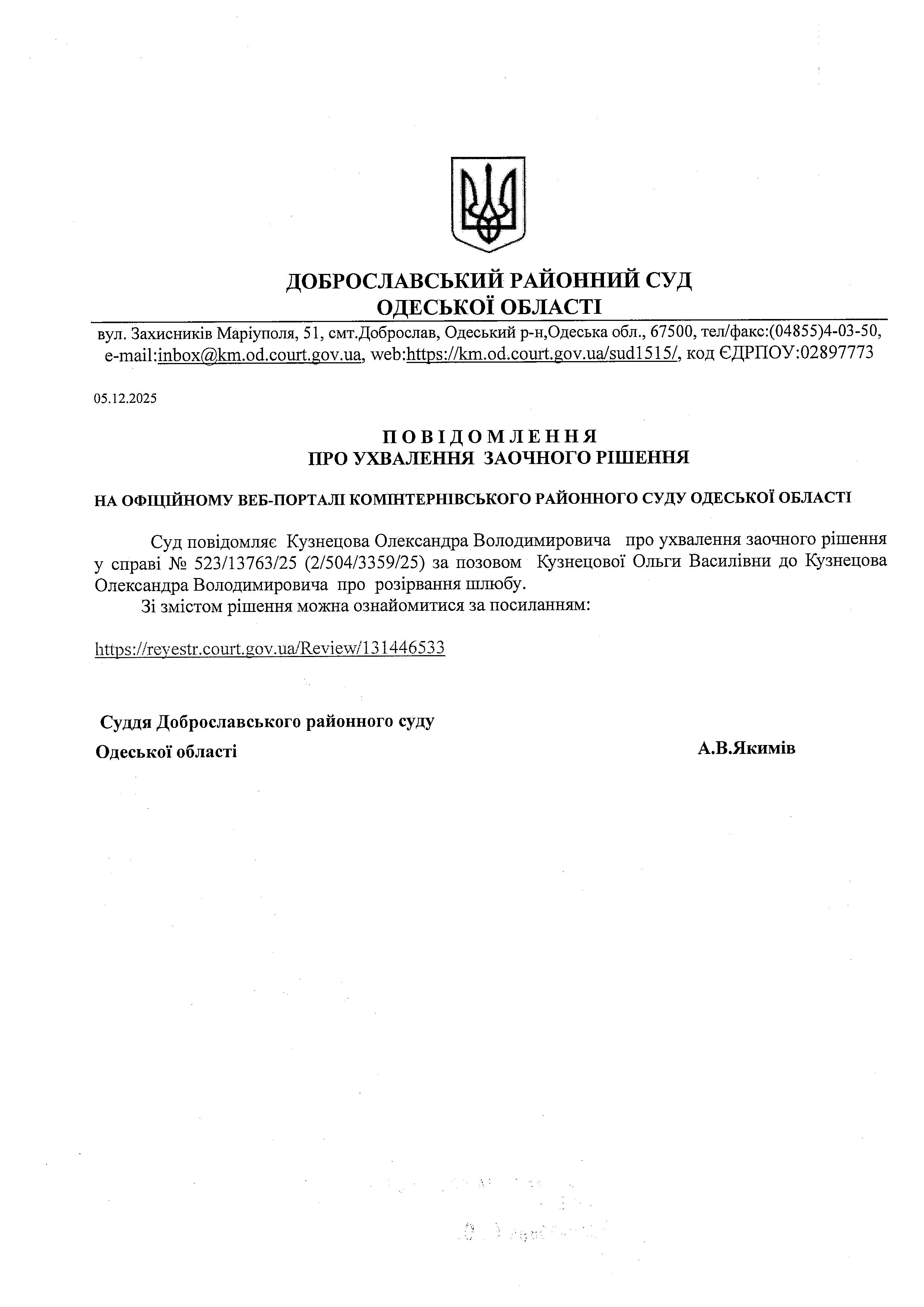 Повідомлення по справі №523/13763/25 стосовно Кузнецова Олександра Володимировича