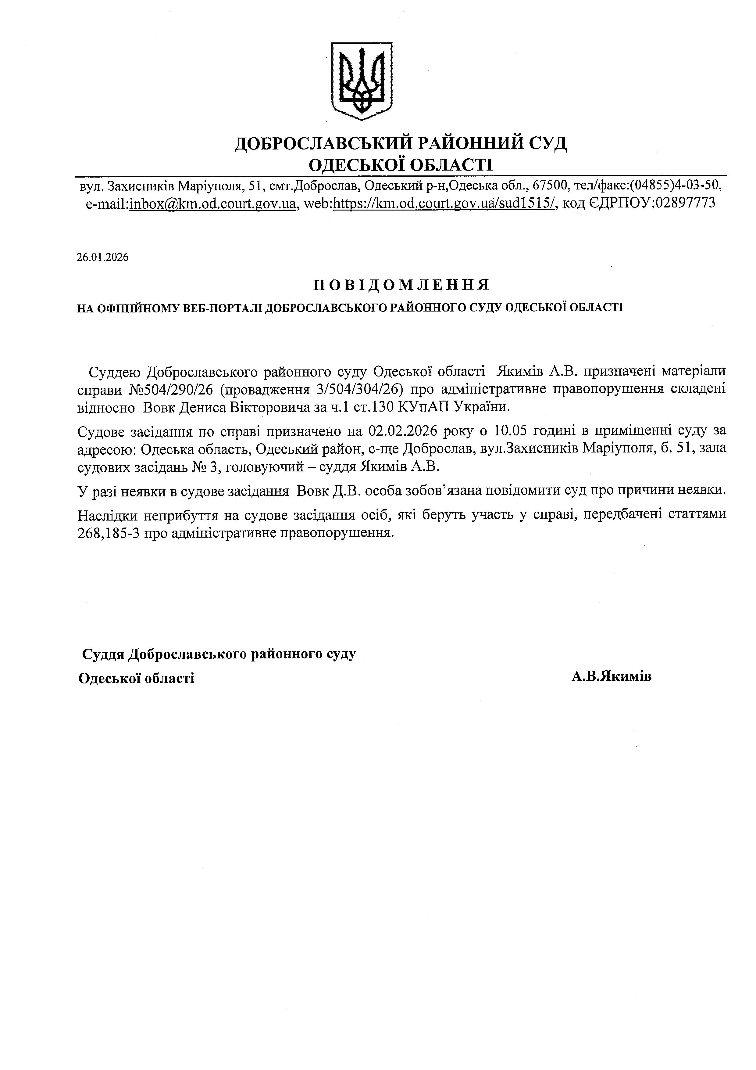 Повідомлення по справі №504/290/26 стосовно Вовк Дениса Вікторовича