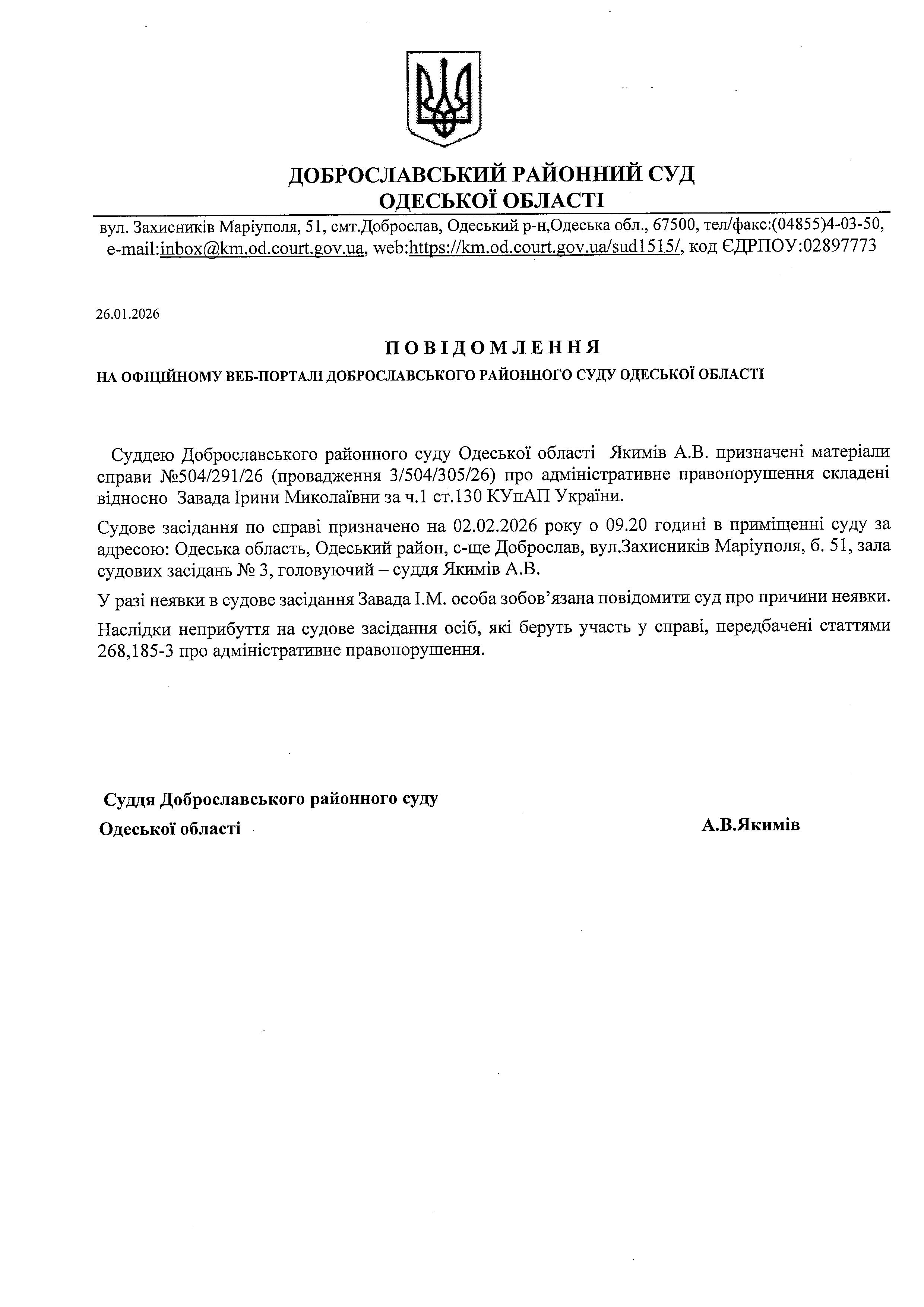 Повідомлення по справі №504/291/26 стосовно Завада Ірини Миколаївни