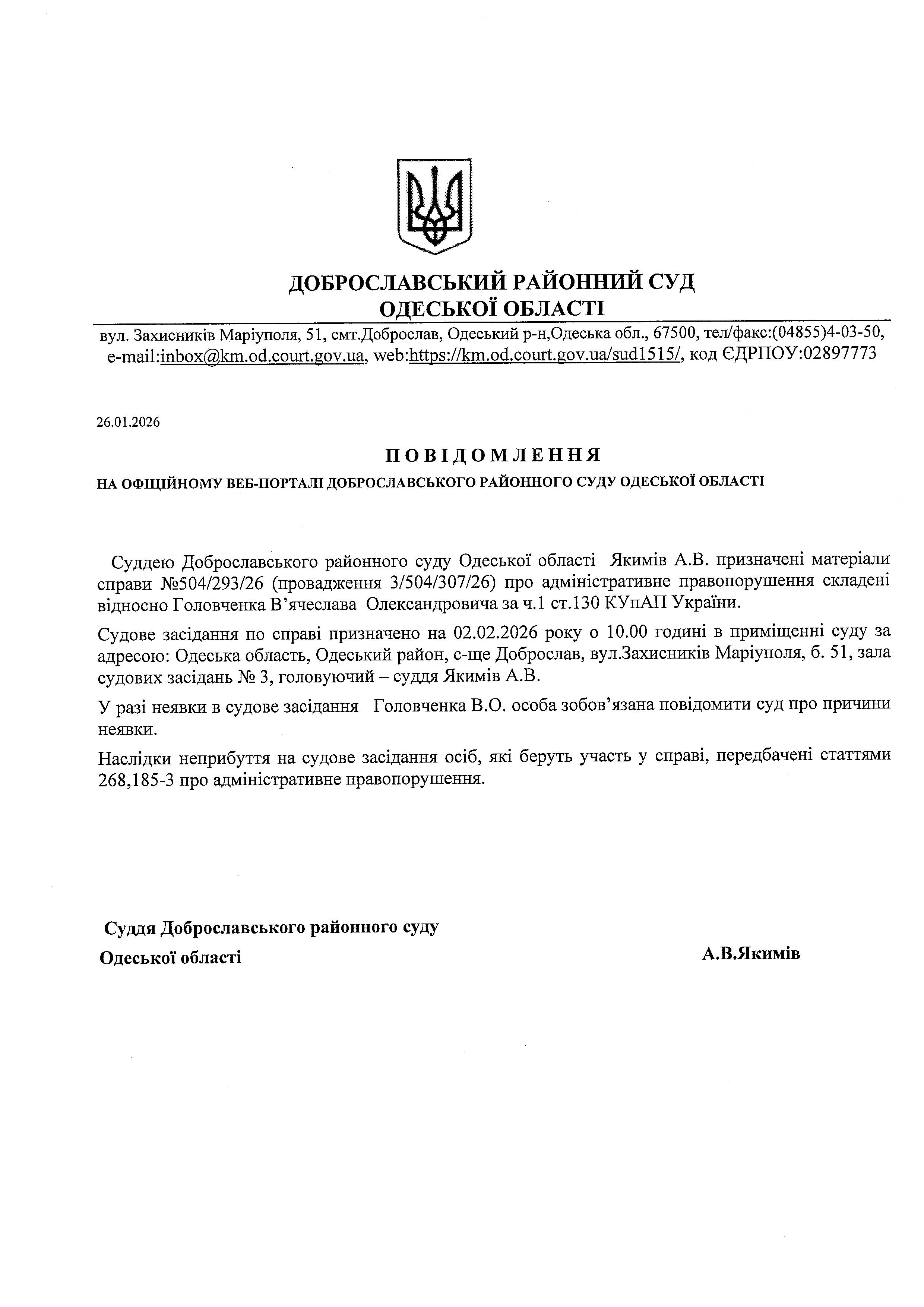 Повідомлення по справі №504/293/26 стосовно Головченка В'ячеслава Олександровича