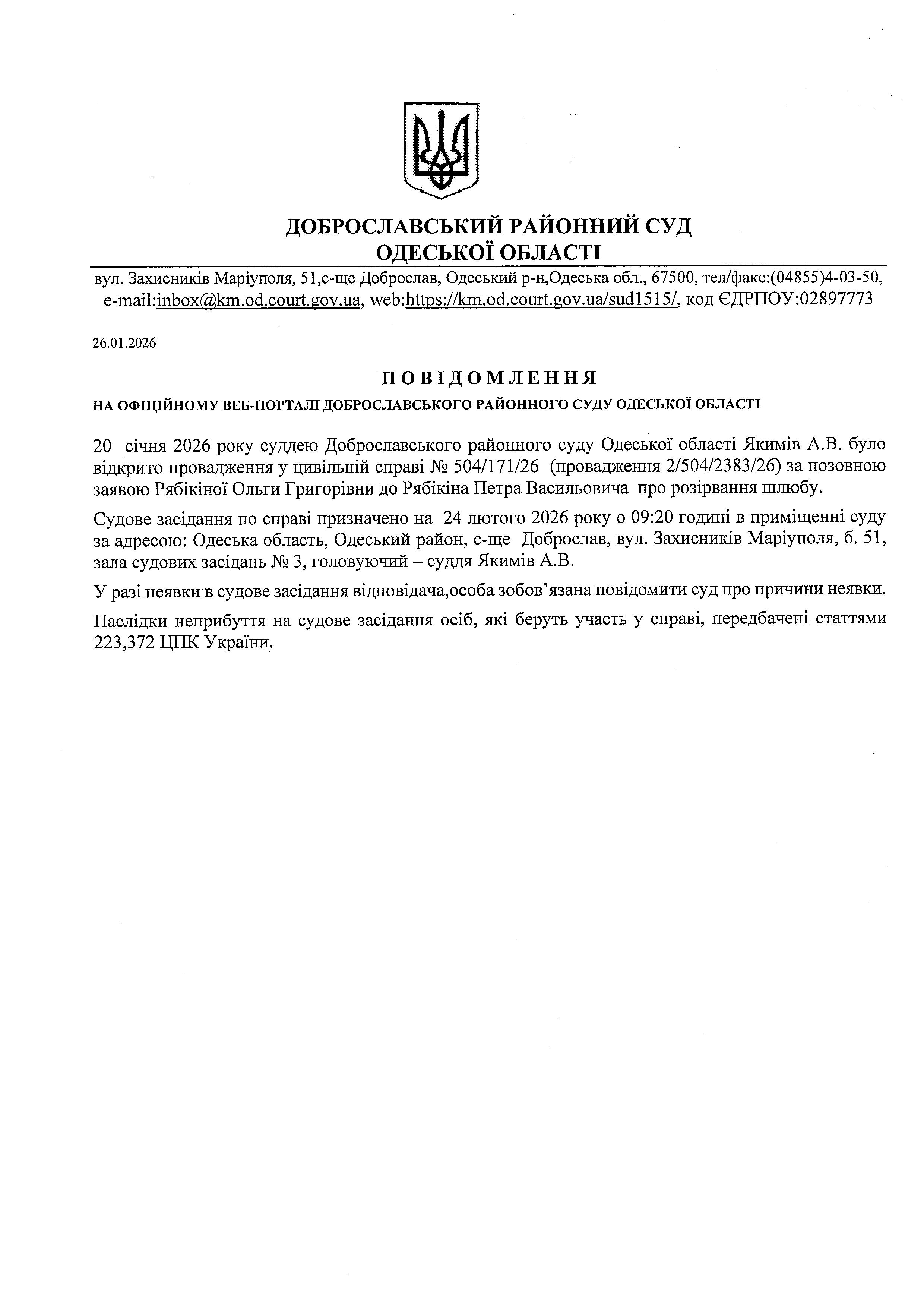 Повідомлення по справі №504/171/26 стосовно Рябікіна Петра Васильовича