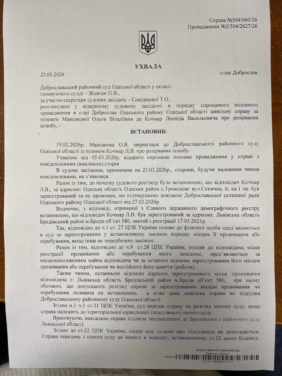 Повідомлення по справі №504/660/26 стосовно Кочмара Леоніда Васильовича