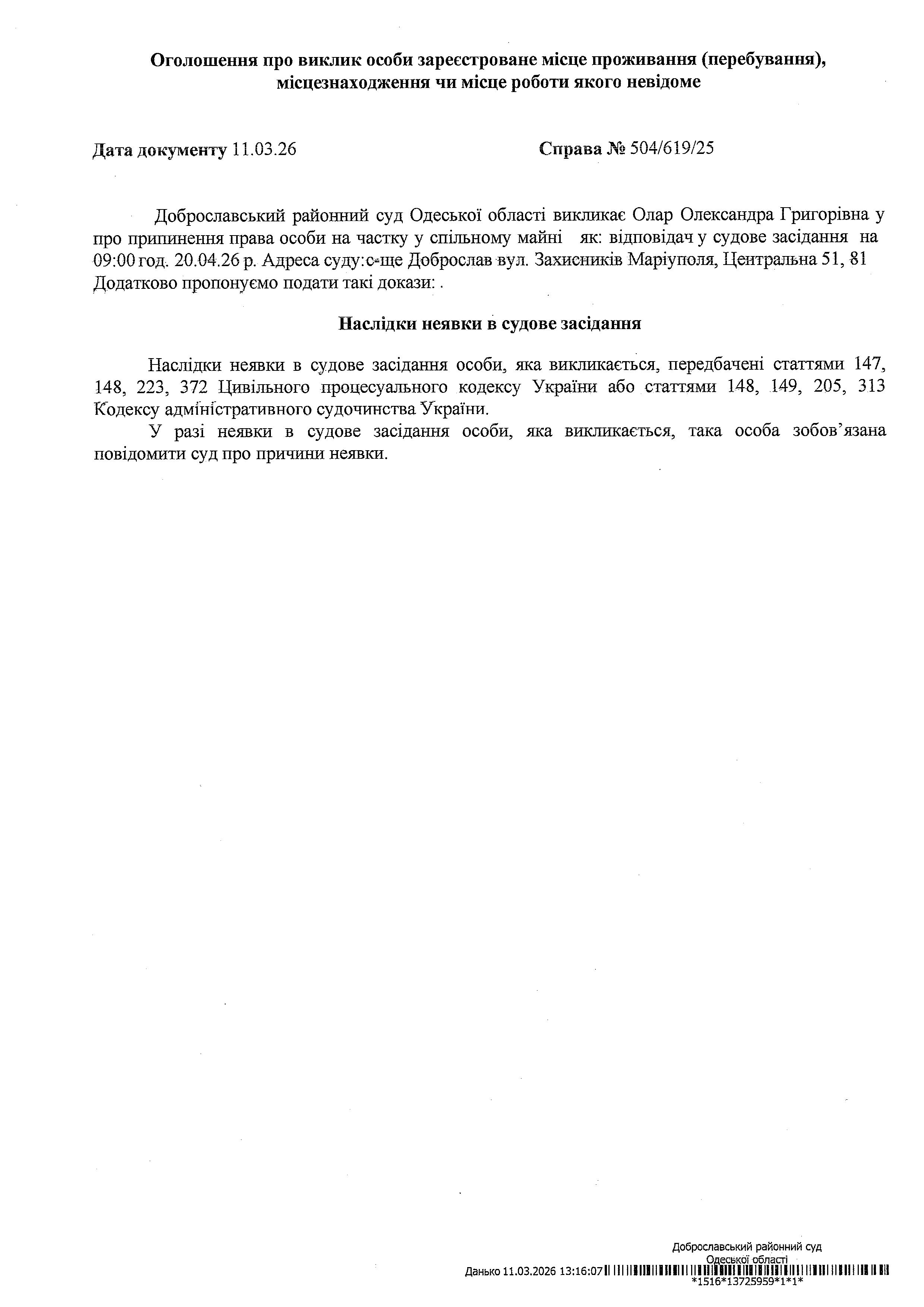 Повідомлення по справі №504/619/25 стосовно Олар Олександри Григорівни
