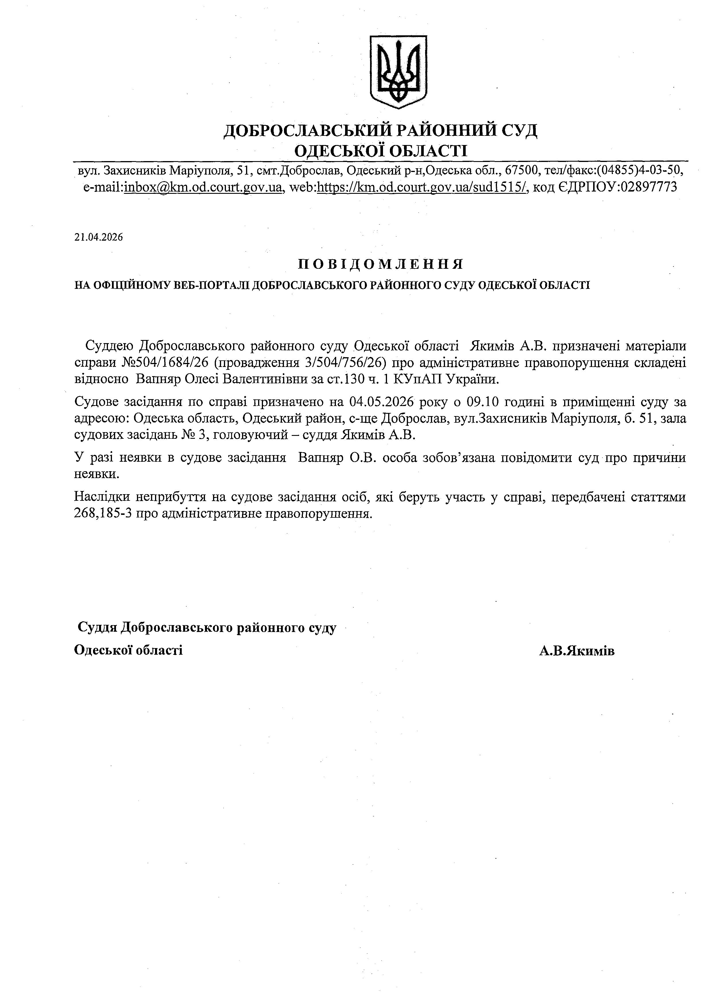 Повідомлення по справі №504/1684/26 стосовно Вапняр Олесі Валентинівни