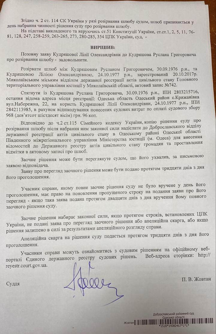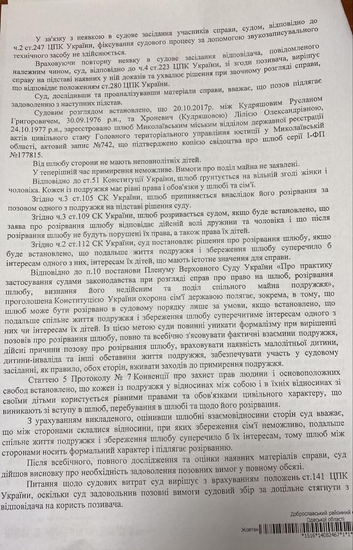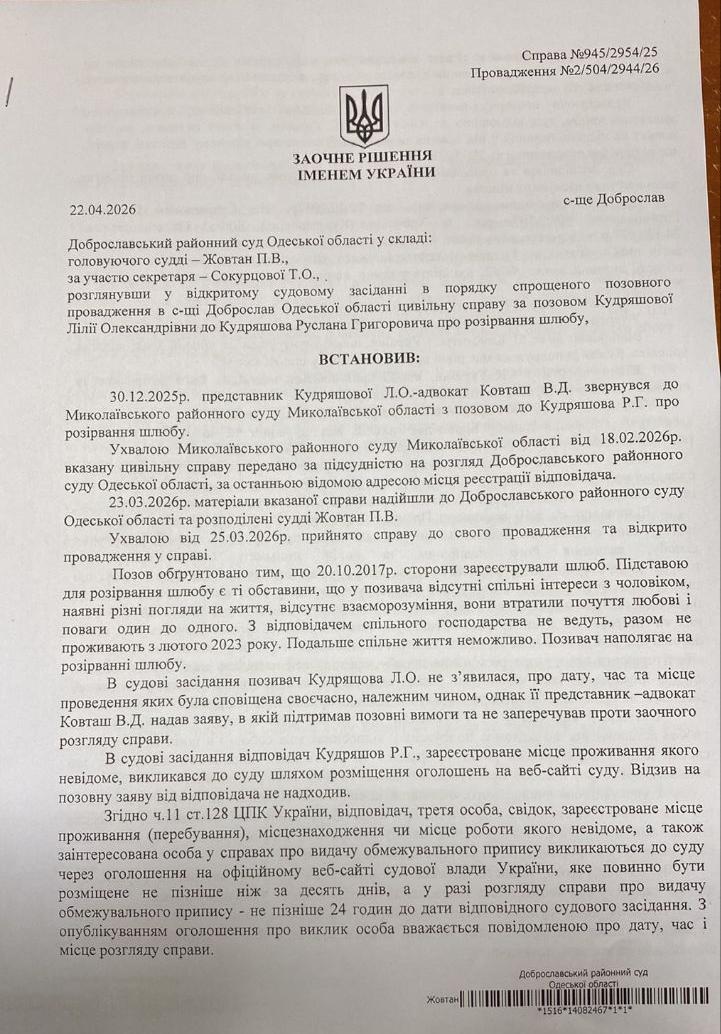 Повідомлення про ухвалення заочного рішення по справі №945/2954/25 стосовно Кудряшова Руслана Григоровича